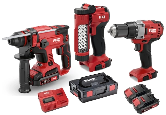 Flex Akku-Kombi-Bohrhammer CHE 18.0-EC / Akku-Bohrschrauber DD 2G 18.0 / LED-Arbeitslampe WL / Schnellladegerät CA / Akku-Pack Li-Ion in L-BOXX®