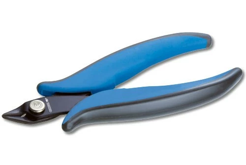 Miniatur Elektronik-Seitenschneider breite, spitze Kopfform, Schneiden 21° gewinkelt, induktiv nachgehärtet, ohne Fase Oberfläche phosphatiert. Schneidwerte: Kupferdraht: max. 1,3 mm / AWG 16
