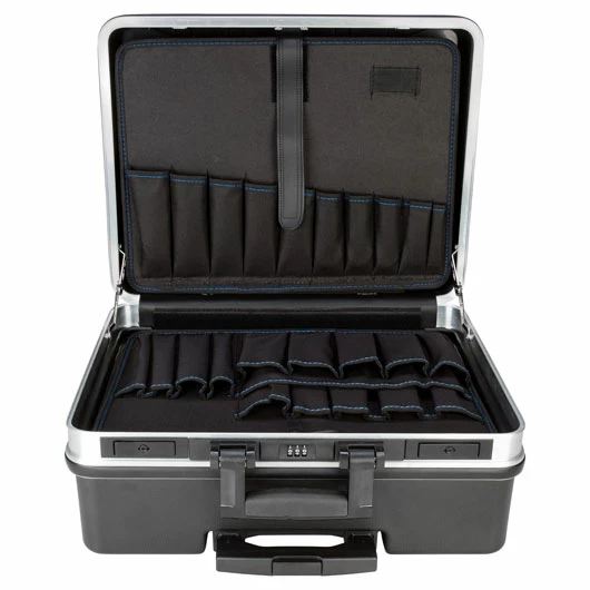 • Herausnehmbare Werkzeugtafel mit 22 Werkzeugtaschen auf Vorder- und Rückseite im Deckel